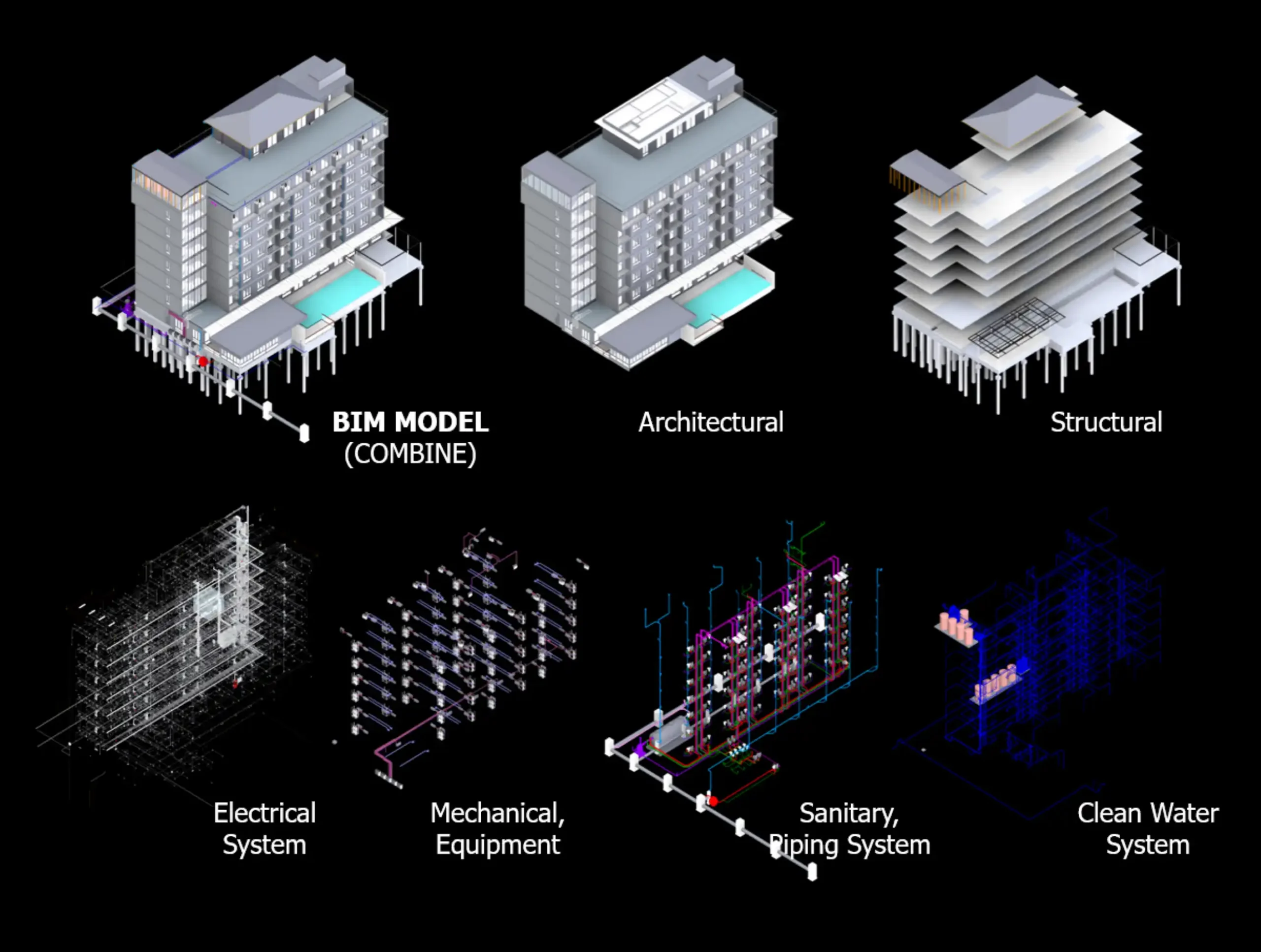 ทั้งสถาปัตยกรรม, โครงสร้าง, ไฟฟ้า, เครื่องกล, สุขาภิบาล และระบบน้ำ โดยเชื่อมโยงแบบทั้งหมดเข้ากับ Real Coordinate ทำให้ทุกฝ่ายเข้าใจพื้นที่ตรงกัน - รัน Clash Detection ทุกระบบก่อนเริ่มก่อสร้าง